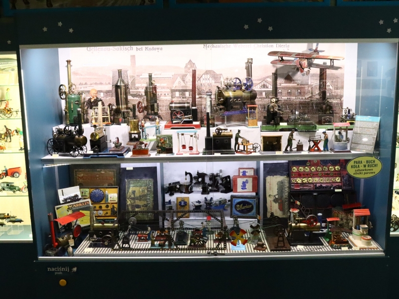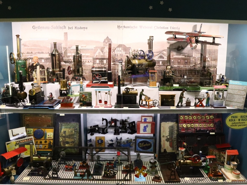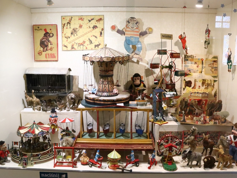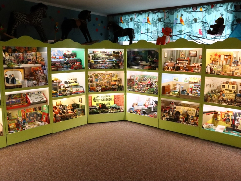 Ekspozycja jest przemyślana i trasa zwiedzania prowadzi przez poszczególne tematycznie powiązane ze sobą wystawy. Możemy tu podziwiać kolekcje m.in. zabawek sudeckich, przedstawiających szmaciane laleczki i miniaturowe mebelki, kolekcje wozów strażackich, ołowianych żołnierzyków, czołgów i innych pojazdów wojskowych, pistoletów i rewolwerów na kapiszony, porcelanowych lalek, szopek bożonarodzeniowych, klocków, w tym klocków LEGO, teatrzyków, porcelanowych zastaw stołowych, figurek zwierząt, zabawek optycznych i industrialnych, takich jak mini silniki parowe. Znajdziemy tu również witrynę poświęconą tematyce marynistycznej z dziesiątkami modeli statków. Na ścianach wiszą małe rowerki dziecięce oraz pierwsze hulajnogi napędzane specjalnymi mechanizmami. Obejrzysz tu również zabawki filmowe, zabawki sakralne, pluszowe misie czy konie na biegunach.