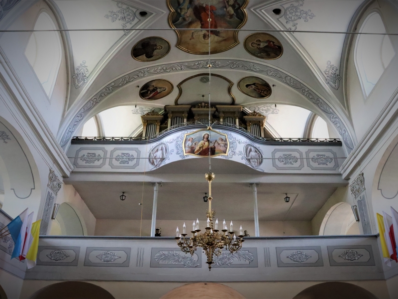 Kolebkowe sklepienie nawy głównej ozdobione jest freskami w stylu nazaretańskim, przedstawiającymi Ostatnią Wieczerzę, Ukrzyżowanie, Wniebowstąpienie, Trójcę Świętą, mnicha-franciszkanina z palcem na ustach (autorstwa Reinscha z Lądka-Zdroju) oraz kilku proroków i świętych. Przeciwlegle do ołtarza znajduje się chór z prospektem organowym, a same organy pochodzą z roku 1905. Do kościoła przylegają dwie neogotyckie kruchty z schodkowymi szczytami, wzniesione w latach 60. XIX wieku, pełniące funkcję wejścia do zakrystii i przedsionka bocznego wejścia.