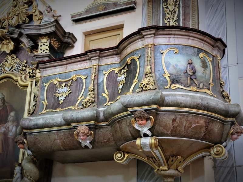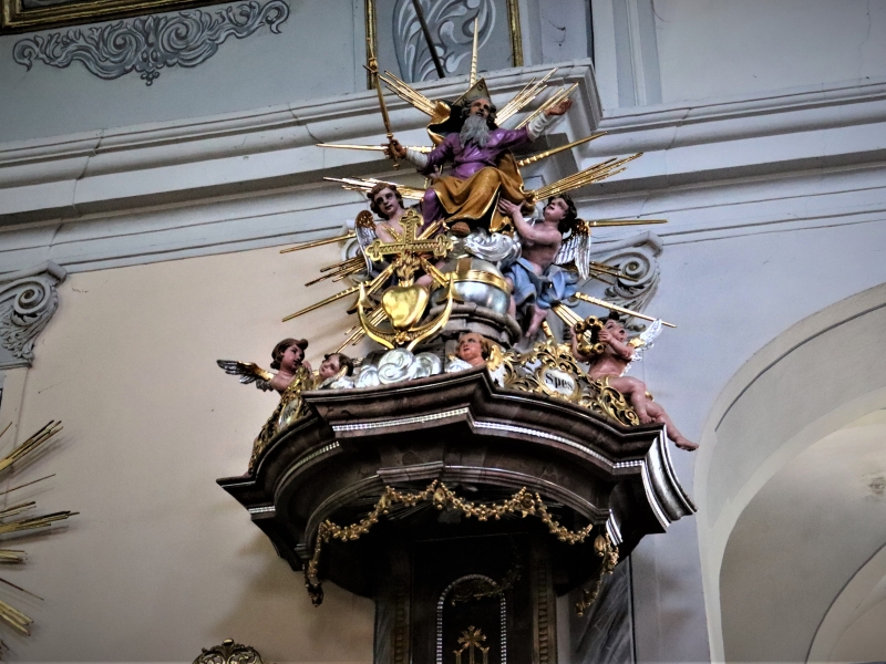 Ambona w stylu neobarokowym, z drugiej połowy XIX wieku, umieszczona jest na południowej ścianie. Na ambonie znajduje się rzeźba Boga Ojca na chmurze, otoczona przez putta. Przed amboną widoczny jest krzyż z kotwicą, symbolizujący wiarę, nadzieję i miłość. Pod amboną znajduje się kamienna chrzcielnica autorstwa Michaela Ignatiusa Klahra. W nawie głównej wiszą drewniane, polichromowane rzeźby w naturalnej wielkości, m.in. św. Józefa, św. Franciszka Ksawerego, św. Antoniego oraz Anioła Stróża z Dzieciątkiem. Na prawo od głównego wejścia znajduje się drewniana Pietà autorstwa Franza Thamma z Lądka-Zdroju z 1876 roku.