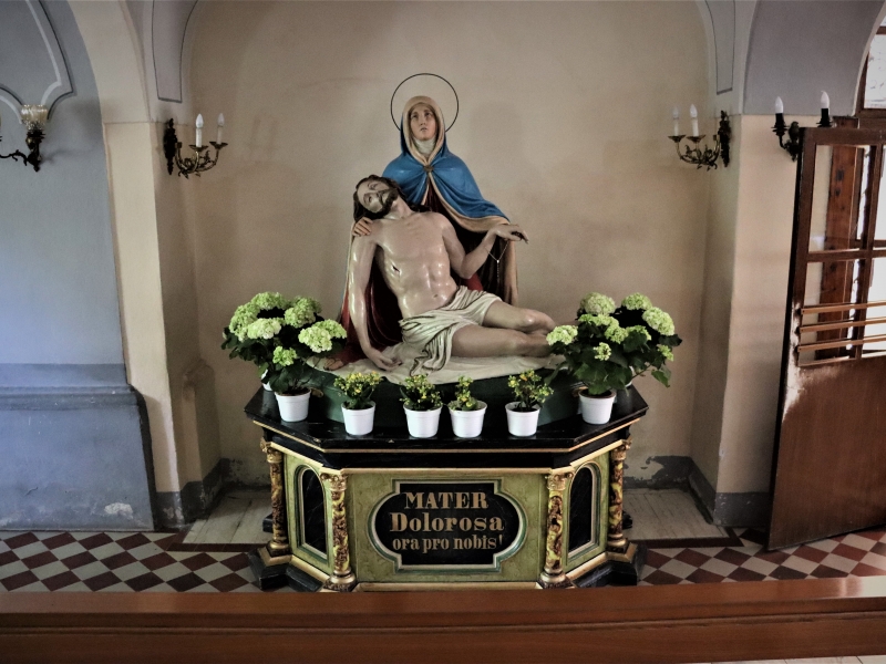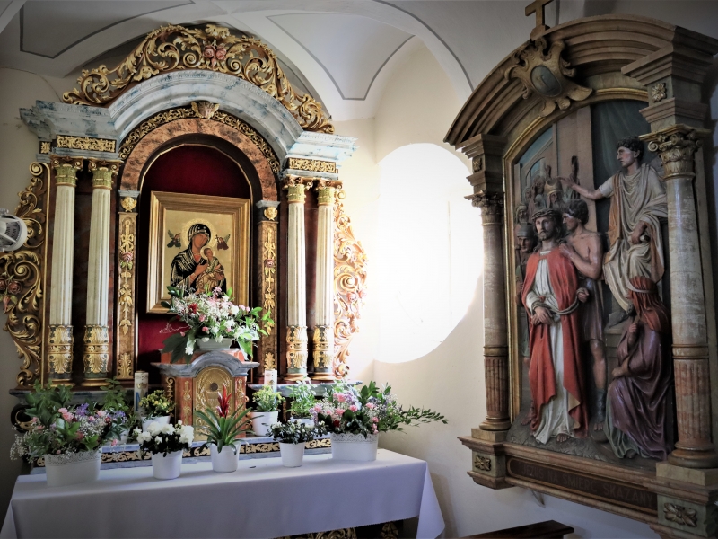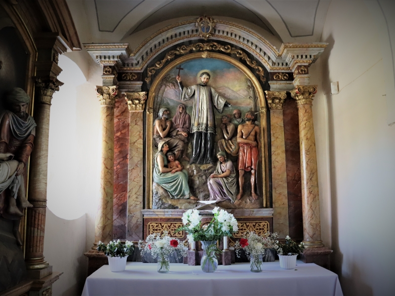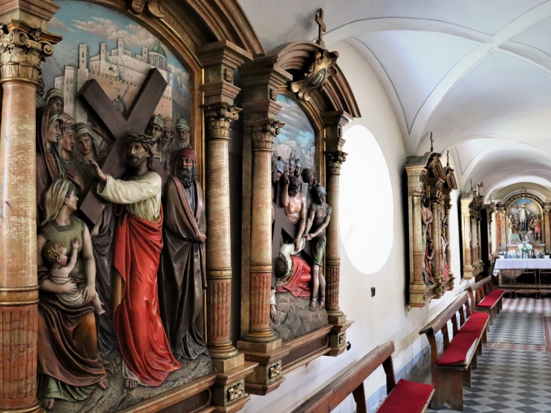 W nawach bocznych zawieszone są drewniane, polichromowane płaskorzeźby stacji drogi krzyżowej, datowane na drugą połowę XIX wieku, autorstwa Franza Thammowi i jego synów. W lewej nawie znajduje się ołtarz św. Franciszka Ksawerego, a w prawej ołtarz Matki Bożej Nieustającej Pomocy, pochodzący z około 1745 roku.