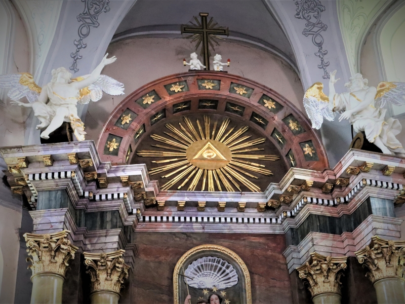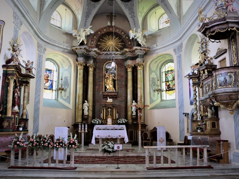 Wnętrze kościoła jest bogato wyposażone w elementy dekoracyjne w stylu barokowym i neobarokowym. Ołtarz główny, pochodzący z lat 1770-1780, zawiera rzeźbę Matki Boskiej z Dzieciątkiem autorstwa słynnego lądeckiego rzeźbiarza Michaela Ignatiusa Klahra. Na ołtarzu umieszczony jest łuk z trójkątem symbolizującym Oko Opatrzności, flankowany przez aniołów i putta. Obok znajdują się figury świętych Piotra i Pawła. W prezbiterium znajdują się również dwa boczne ołtarze: jeden poświęcony Sercu Jezusowemu, drugi św. Annie.